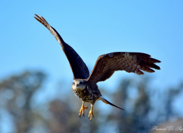 Composición de gavilán en vuelo, sobre fondo difuso de arboles y hojas secas en la base de la imagen