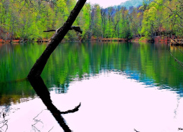 river water green trees boat flows