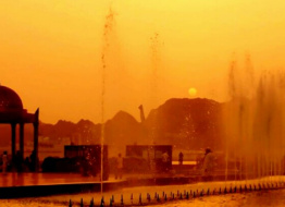 nature sunrise town park buildings trees cars