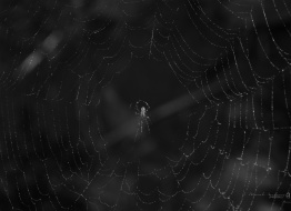 Photo of a water drop at the center of a spider web. The spider is hiding behind the water drop.